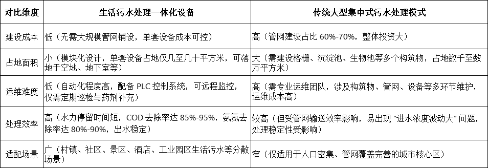 相較于傳統污水處理模式,生活污水處理一體化設備在技術(shù)、經(jīng)濟、運維等多維度均展現出顯著(zhù)優(yōu)勢,完美適配分散場(chǎng)景的治理需求: